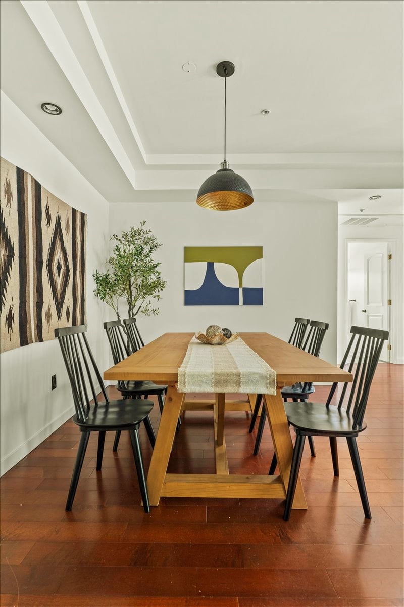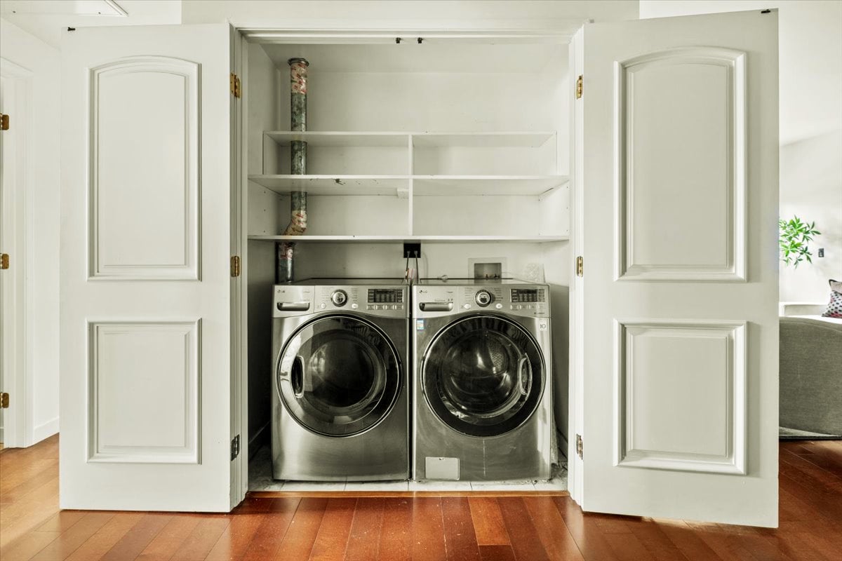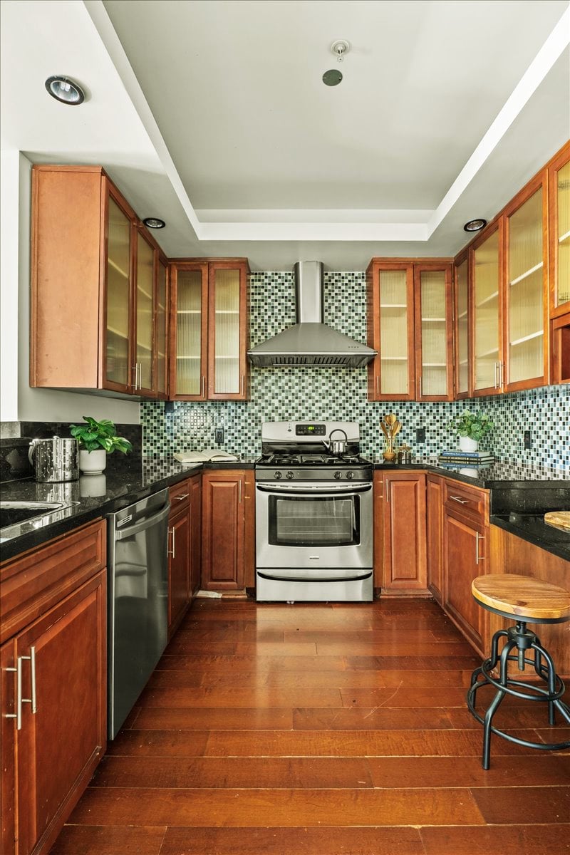 Other upgrades include: Renovated luxury kitchen with granite countertops and custom glass-inlay upper cabinets + stainless steel appliances + hardwood floors + in-unit laundry room + recessed lighting + high ceilings. The home’s layout allows for great natural light in each room. The primary bedroom suite is extra large with luxury dual-vanity bathroom and spa tub. Professionally organized closets in every bedroom. Building was built new in 2007, so there is Central AC and Heat, newer systems, and this unit features 2 DIRECT ACCESS PARKING SPOTS in underground secure parking.